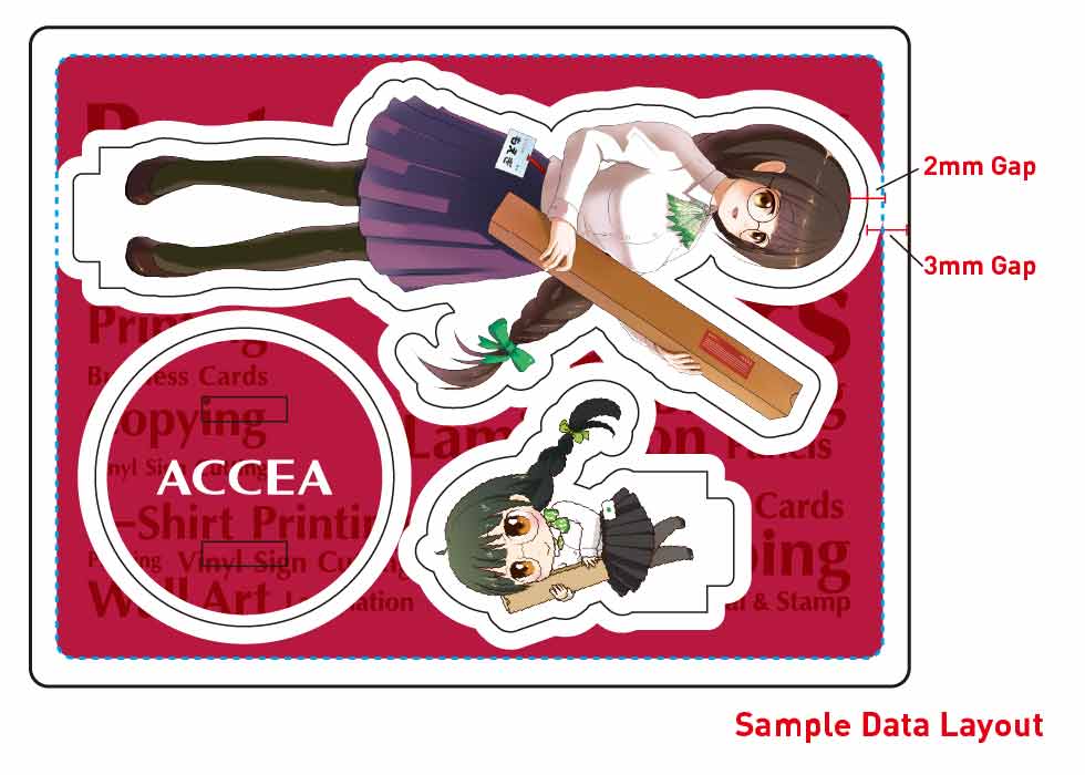 アクセアでのアクリルフィギュア・アクリルスタンド(アクスタ)は全てオンデマンド印刷になります。 オンデマンド印刷のメリットは、少部数(1部)でも安く印刷できる点であり、 アクリルフィギュア・アクリルスタンド(アクスタ)は、自分だけのオリジナルデザインをプリントできるアイテムで、記念品、プレゼントに最適です。